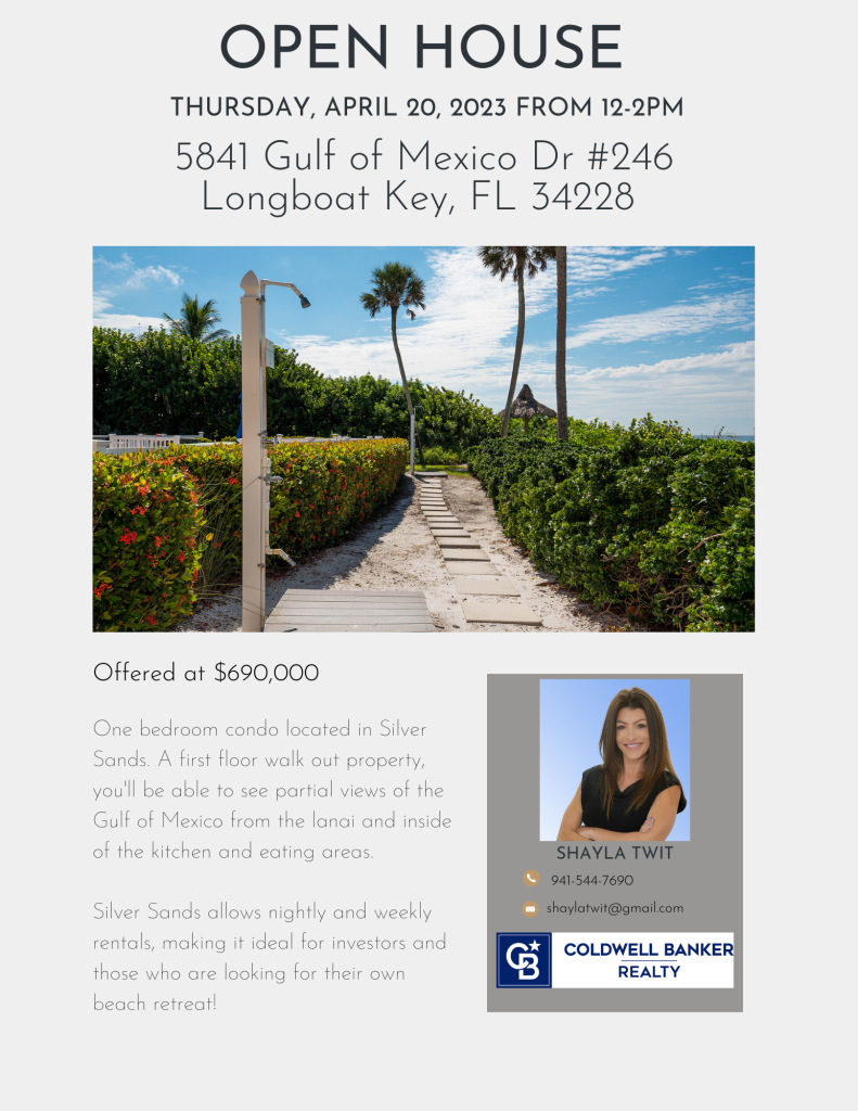 Silver Sands Open House! 5841 GULF OF MEXICO DR, #246, LONGBOAT KEY, FL 34228 on THURSDAY, APRIL 20 from 12-2PM 1 bedroom. 1 bathroom, 520 sq. ft. total, beach access, community pool Rare opportunity to view this highly rented LBK Silver Sands unit. Price has been...