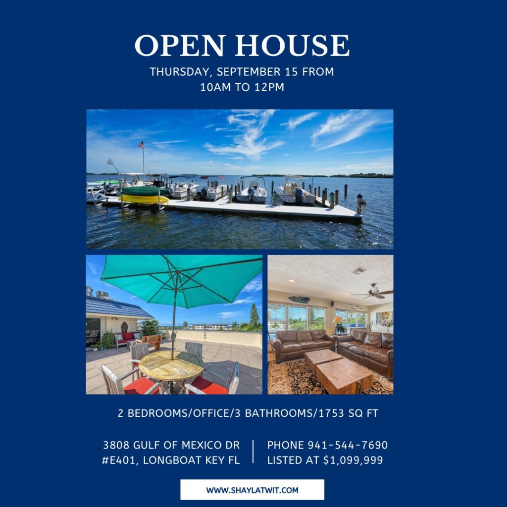 Come see me Thursday, September 15 from 10AM to 12PM at my penthouse listing in Beach Harbor Club! Address: 3808 GULF OF MEXICO DR, #E401, LONGBOAT KEY, FL 34228 2 bedrooms, 3 bathrooms, 1100 sq ft terrace, completely updated, 1750 sq. ft, boat slips, deeded beach...