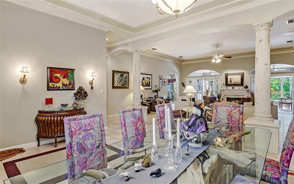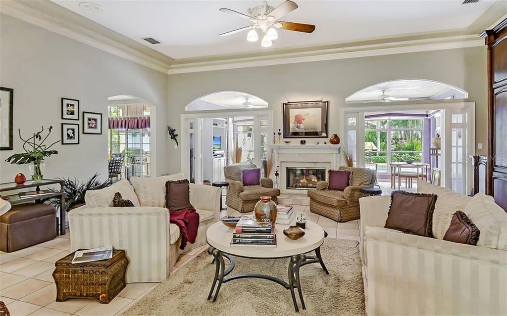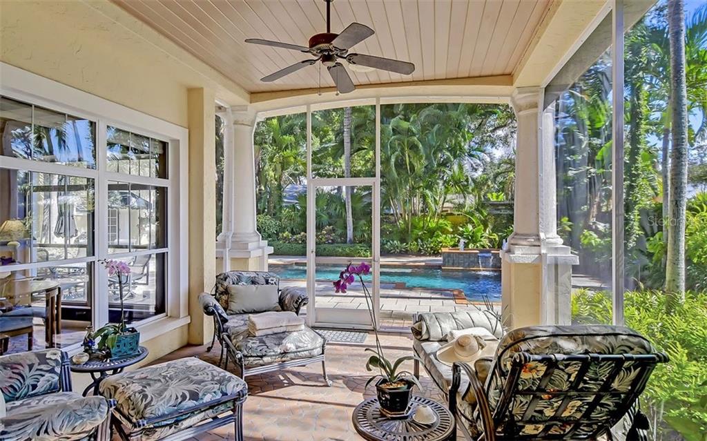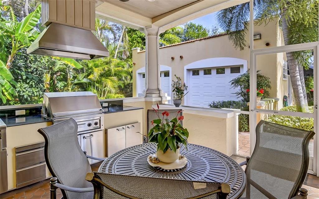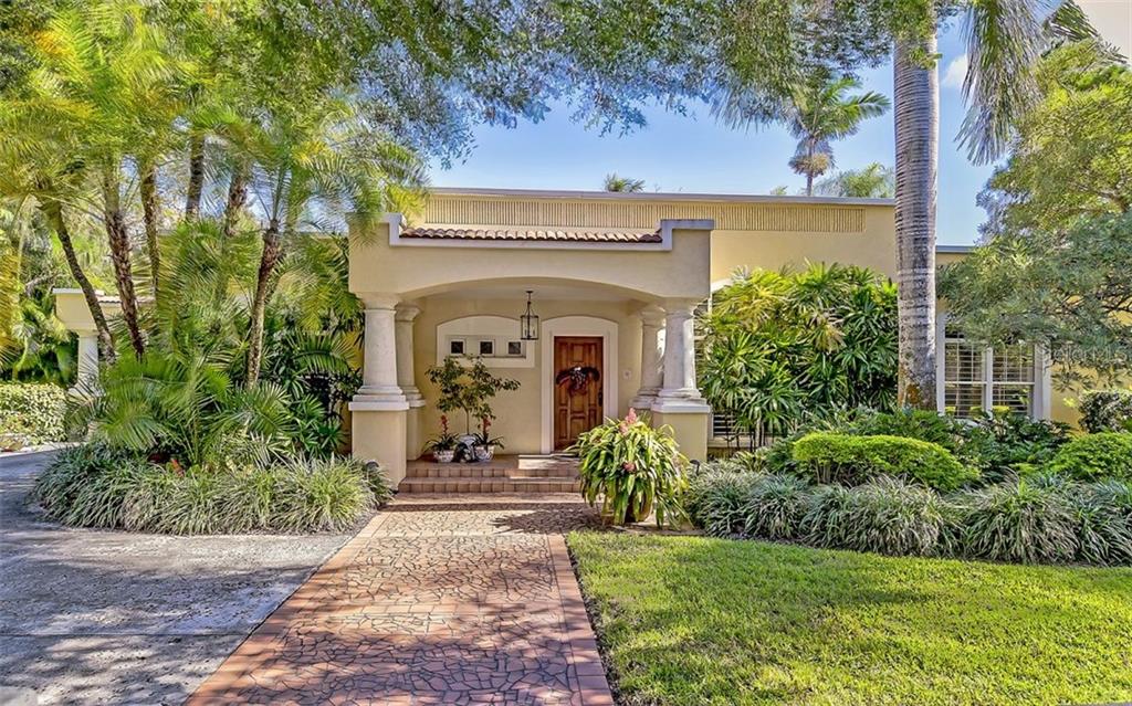 West of Trail premium location in Sarasota close to downtown, bayfront, and Sarasota Memorial Hospital. Abundant vegetation ensures both a high level of privacy and tranquility. Set on a 14,000 sq. ft. lot, with 11-foot ceilings, this single-story home is a joy to behold and is well appointed in every respect – from the striking gated entrance and open interior concept through to the incredible backyard oasis with uncompromised privacy. On a quiet street, the home blends seamlessly with its idyllic setting. The grand entry welcomes residents to a home that is both artistic and comfortable. The enormous living and dining area feature a natural gas fireplace, and custom finishes. Additionally, from the living room, two sets of French doors open to a cozy family room with floor-to-ceiling windows, offering an exciting sense of connection to the pool area and the beautiful garden. An impressive eat-in kitchen features a Wolf gas range, SubZero refrigerator, two wine refrigerators, and breakfast bar. The space effortlessly opens to a screened in porch with a fully equipped outdoor kitchen for dining al fresco. Each of the three bedrooms has its own bathroom. The spacious master suite has access to its own screened in porch with beautiful surroundings and features a luxurious bath with soaking tub, and large walk-in shower. Perfect for multi-generational living or extended stay guests, the fourth bedroom is detached and has its own bathroom and air conditioning. Complete with immediate access to the pool, use it for guest overflow or a serene office/studio. A one-car garage is air conditioned as well. A covered porte-cochère located by the kitchen entrance is conveniently used for loading groceries and a long driveway can accommodate several cars. The saltwater heated pool was completely refinished with new plumbing and new equipment along with the addition of a water feature. Abundant vegetation ensures both a high level of privacy and tranquility.