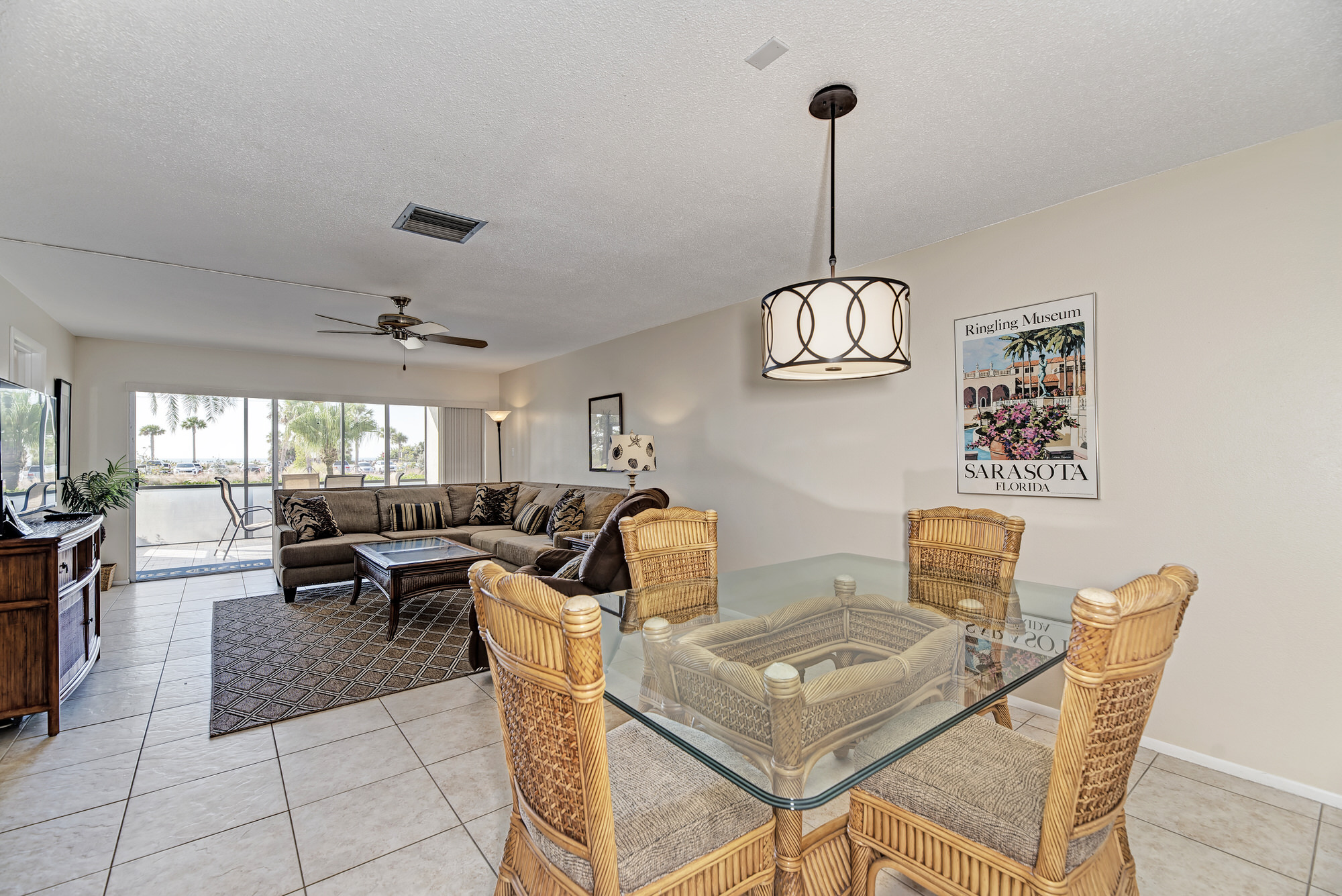 This well cared for Crescent Royale split plan condo features 2b/2ba, 1st floor location with no carpeting {w/tile and laminate wood} AND comes completely furnished! Directly across from, and an easy walk to, the world famous #1 Siesta Key Beach, paradise awaits! Sip your favorite spirits or coffee while taking in the sand, surf and breathtaking sunsets from your generously sized covered and screened lanai with cooling fan. Kitchen features granite countertops and light appliances. All neutral paint color throughout, the property also features en suite bathrooms in each bedroom and kitchen that overlooks the dining/living space which can even capture the beach! Equipped w/common laundry facility and private storage unit on the fourth floor, heated oversized pool, state of the art fitness facility, onsite rental management and office, you’ll find this to be a very comfortable environment! Gated for your privacy and security, the neighborhood is also very well funded and has quite a healthy reserve fund that keeps it well managed and financially solvent. Ask your agent for a copy of our rental history. Conveniently located just South of the Siesta Key Village and within biking distance, you’ll find a number of great restaurants, the grocery market and some fun pubs as well as fine dining options. As part of the $25M SK pavilion and parking renovation, you can also enjoy public tennis and sand volleyball courts! Come and take a gander at this move in ready property!