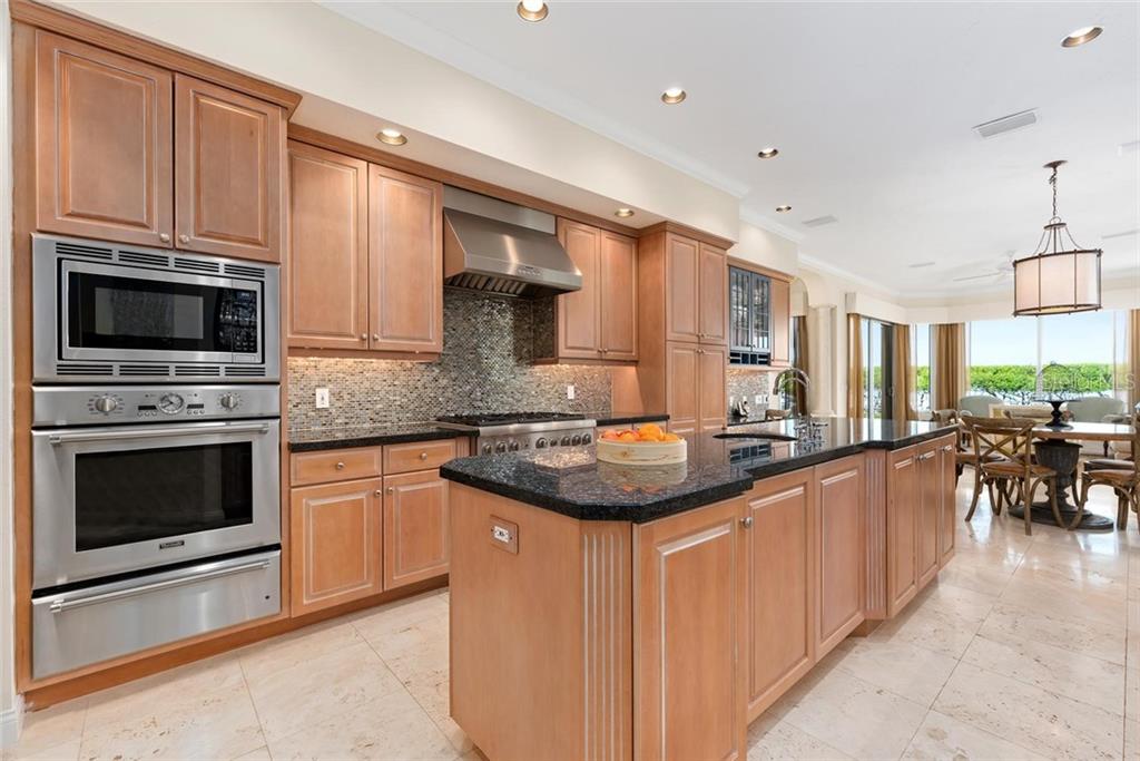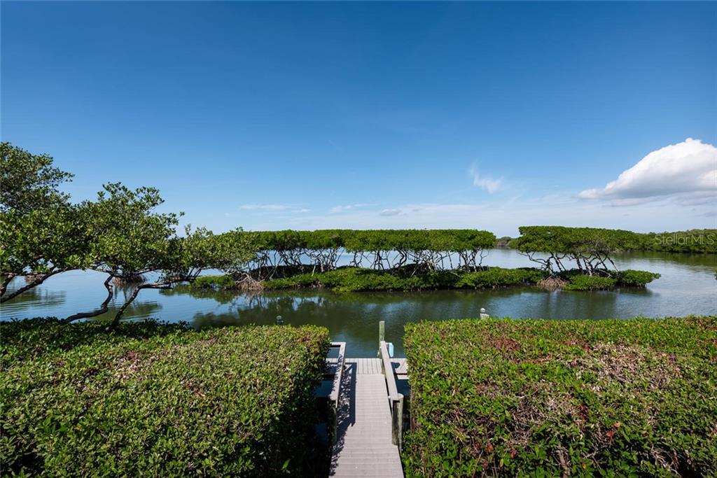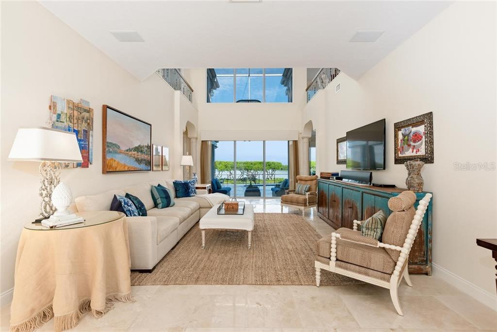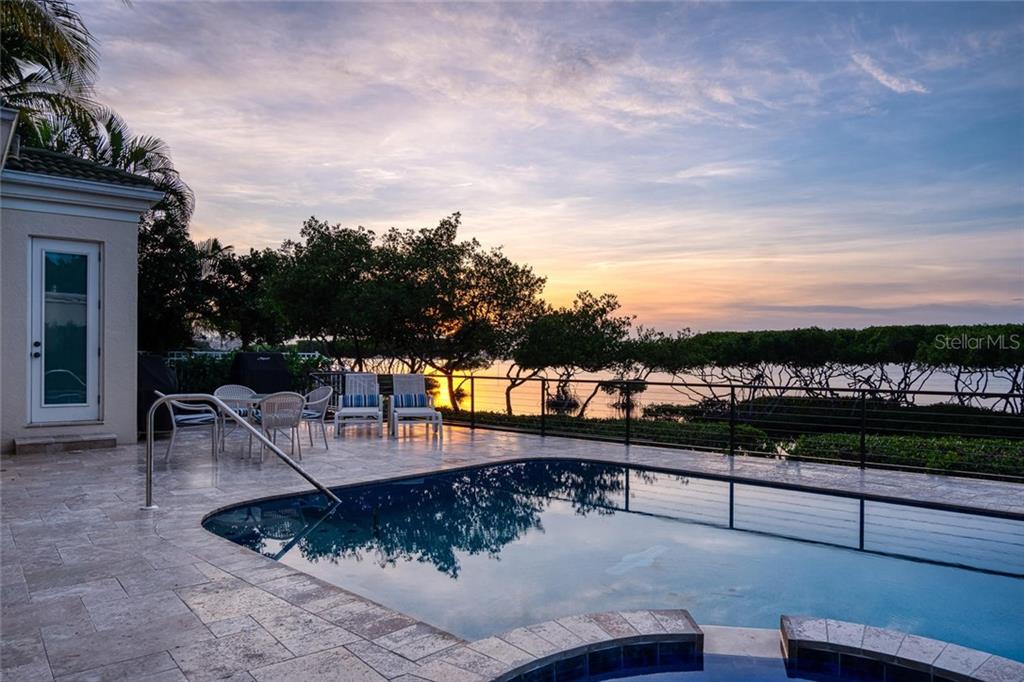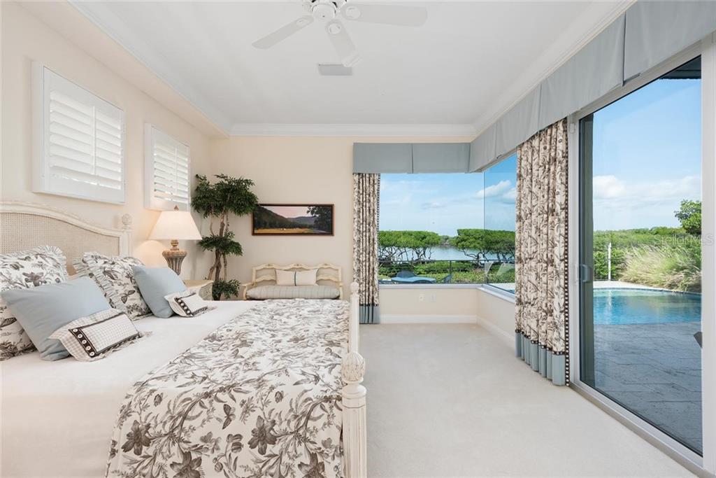Set in the highly desirable Bay Isles Queens Harbour community located behind the gates of the Harbourside section of the Longboat Key Club, sits this immaculately maintained 4 bedroom home overlooking Sarasota Bay. Upon entering you are welcomed by abundant natural light from two stories of windows facing the bay in the great room opening up to the 2nd living level. The gourmet kitchen boasts stainless steel Thermador appliances with a large center island, built-in desk and every convenience for the discerning chef. Fall asleep with the tranquil bay waters in the background seen through oversized aquarium glass windows in the first floor master suite. Entertaining is easy with 3 ensuite guest bedrooms upstairs, a family room on each level, formal dining room with wet bar and an expansive outdoor terrace. On breezy evenings lower the auto screen over the covered terrace and enjoy the wildlife water activity around the mangroves while the sunsets. Other fine details include an upstairs wet bar, a powder bath on each floor, upstairs terrace, impact windows, separate laundry room, a full pool bath, an Ecowater System and a 2 car garage. Residing in Bay Isles entitles owners to the use of the private Bay Isles Beach Club offering shower facilities, lockers, volleyball, barbeque and picnic areas on the gulf side. The Queens Harbour Association dues includes house painting every five years and lawn maintenance.