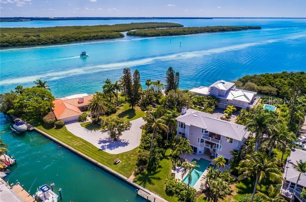 Custom three-level waterfront home on sailboat depth canal, one in from the Bay. Designed to capture sunrises, sunsets & light throughout the day. Fantastic boating. Direct access to the bay. No fixed bridges to the Gulf of Mexico. Deeded beach just steps away. Large heated pool with integrated spa. Composite dock, 10,000 lb lift & seawall. Meticulously maintained home. New roof in 2016 meets hurricane code & includes full 25-year warranty. Siding includes a full 50-year warranty. Main living area is on the third floor to maximize views: open floor plan featuring kitchen, great room, dining plus separate cherry library. Solid oak tongue-in-groove 3/4-inch wood floors; fireplace with coral surround and carved mantel & hearth; decks & balconies oriented for sunrises and sunsets; water views throughout; 8-foot doors; volume ceilings; and custom features. Second floor features a split bedroom plan. Master captures both bay & canal views; large walk-in closet; and spacious master bath. Bedroom two en-suite with full bath; bedroom three with bay views; lots of closet and storage space; plus a convenient laundry. Split garages: deep tandem garage on one side; plus oversized two car garage with dumbwaiter. Mature tropical landscaping with automatic sprinkler system. This custom home captures the essence of island life: bay & water views; sunrises & sunsets; deeded beach; boating; quick Gulf access; and a relaxed island lifestyle in one of Longboat’s best year-round neighborhoods.